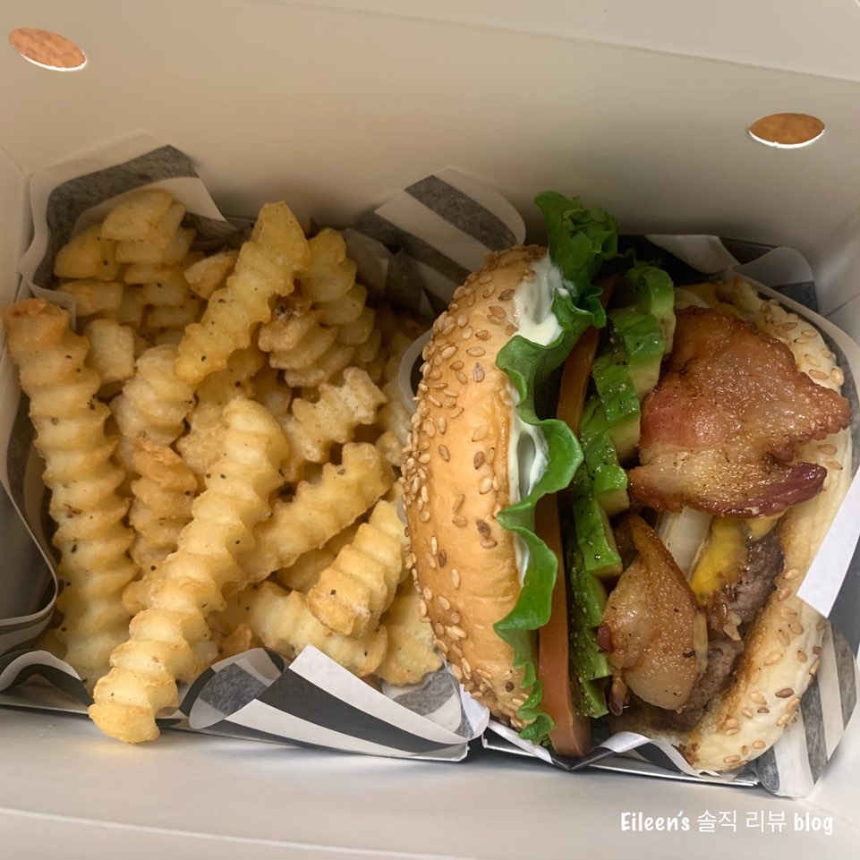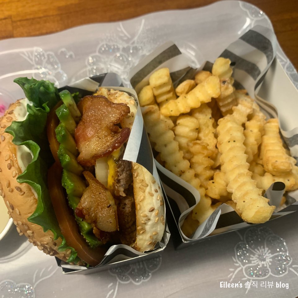 배달 온 아보카도 버거와 갈릭버터 프라이!!
