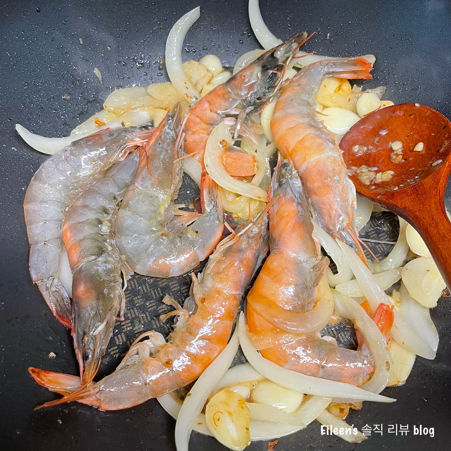 양파, 마늘, 그리고 새우를 볶아줍니다.