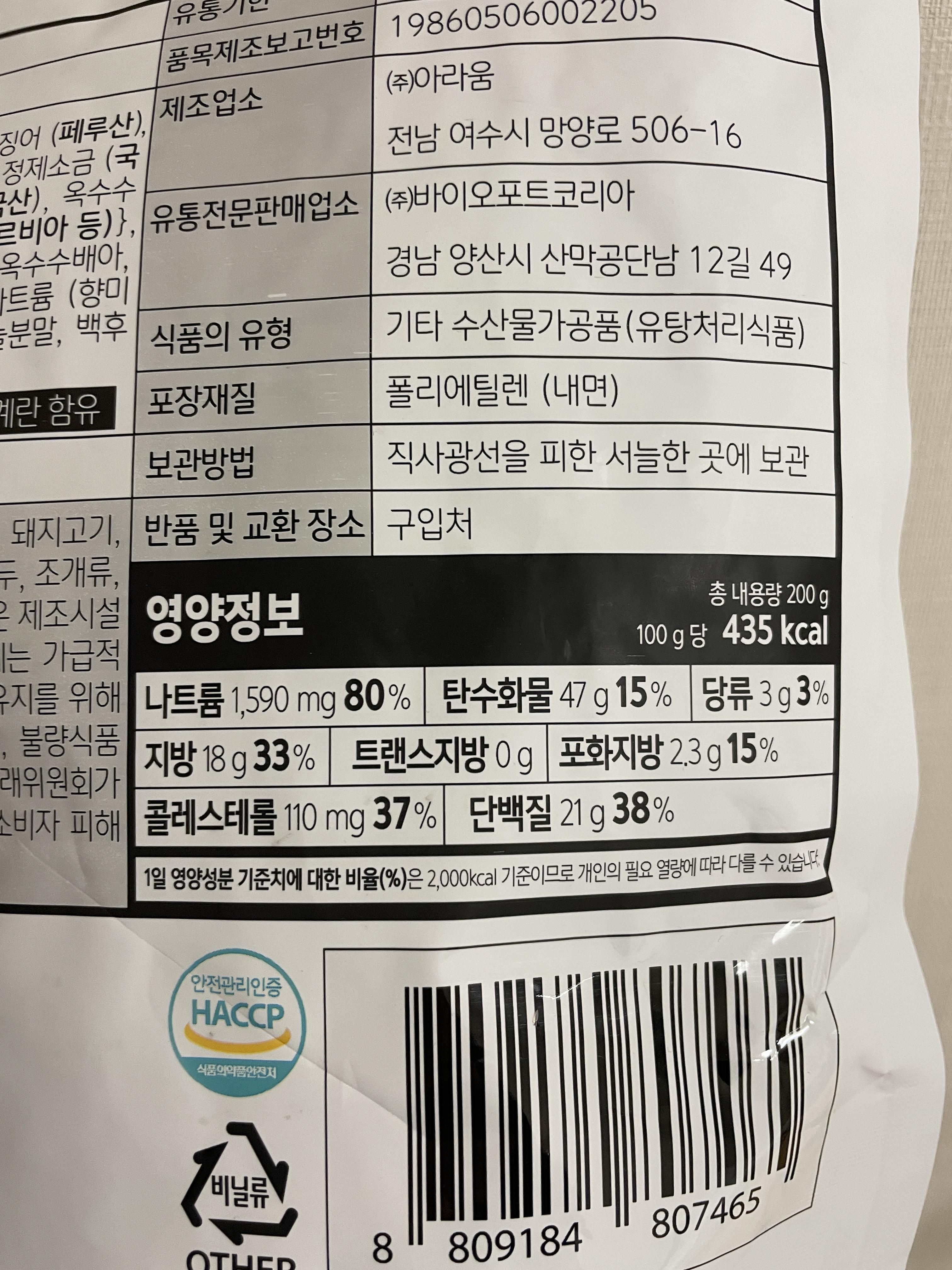 100g당 칼로리는 435kcal며, 200g인 한 봉지를 모두 섭취할 경우 870kcal...
