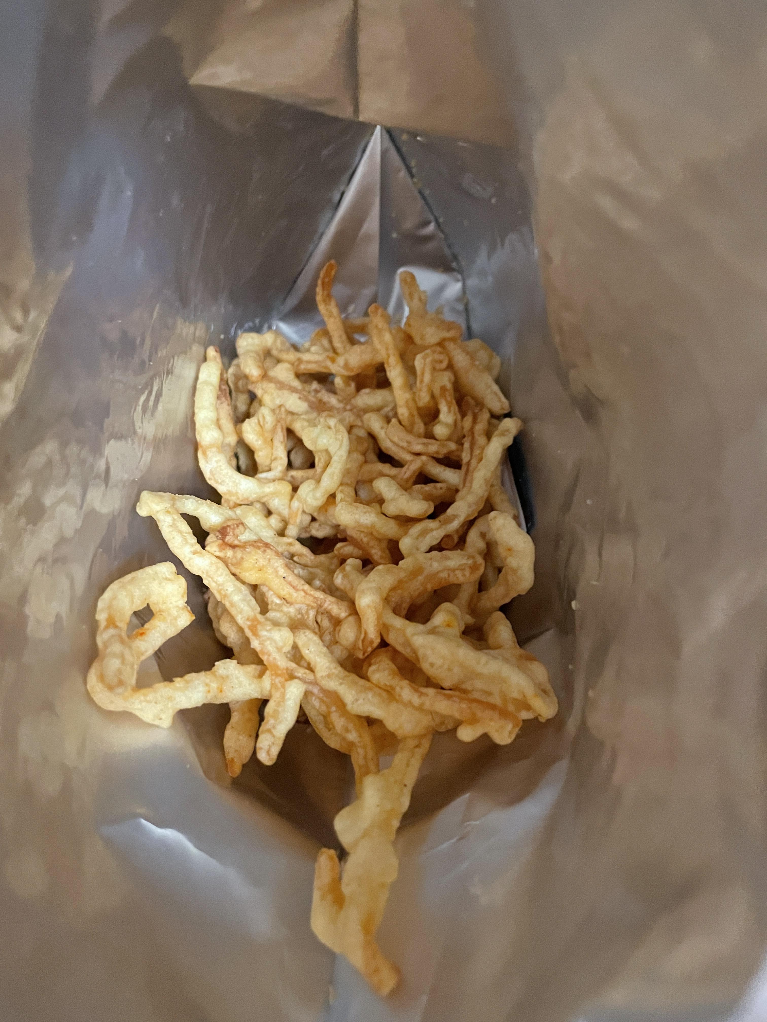 백진미채를 튀겨서 만든 거라 튀김 모양과 크기는 제각각이에요~