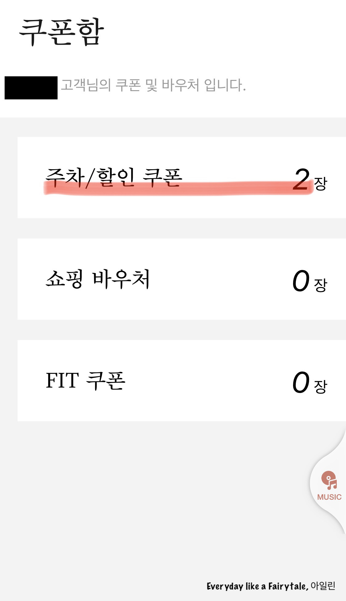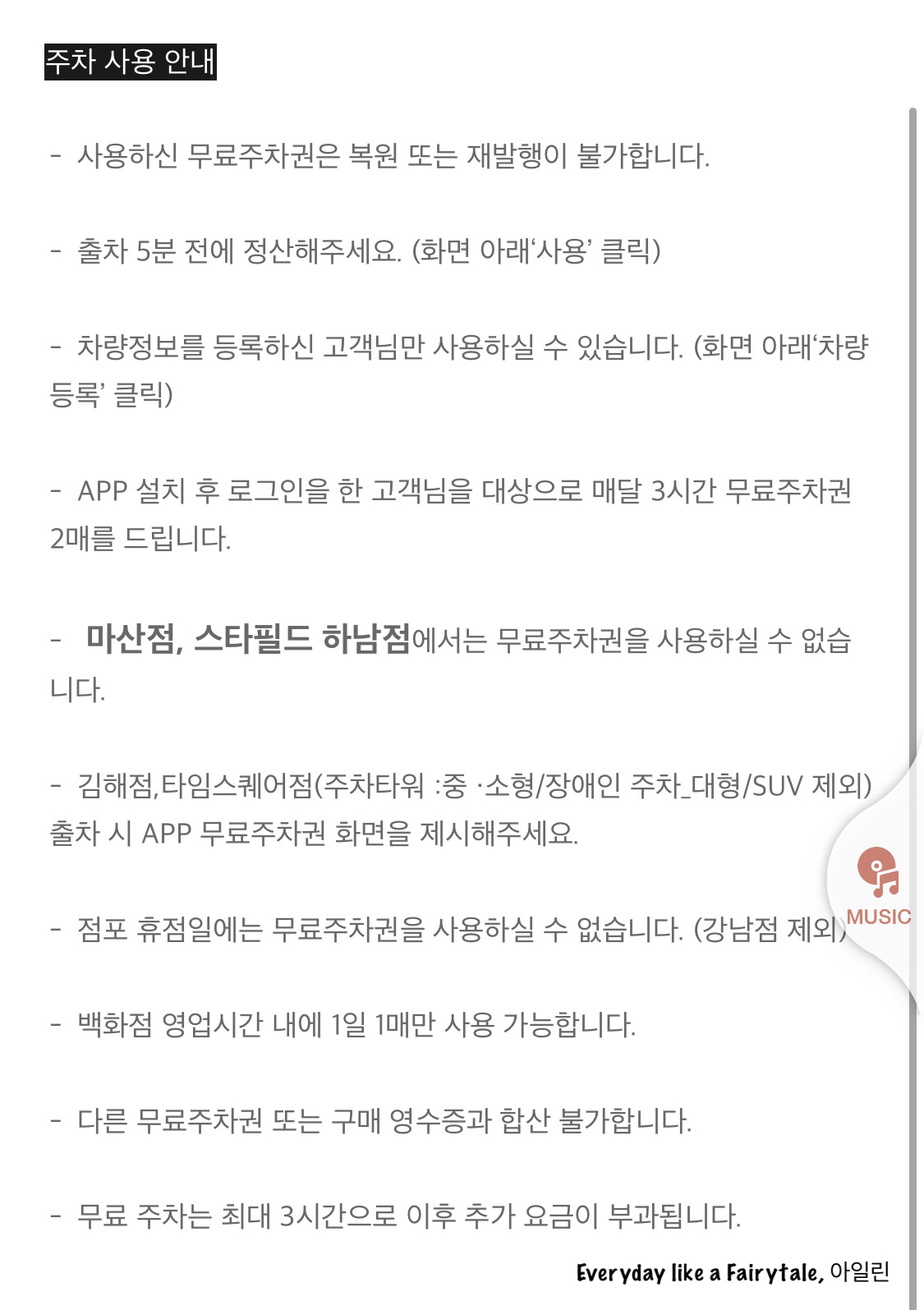 - 다른 무료주차권 또는 구매 영수증과 합산 불가