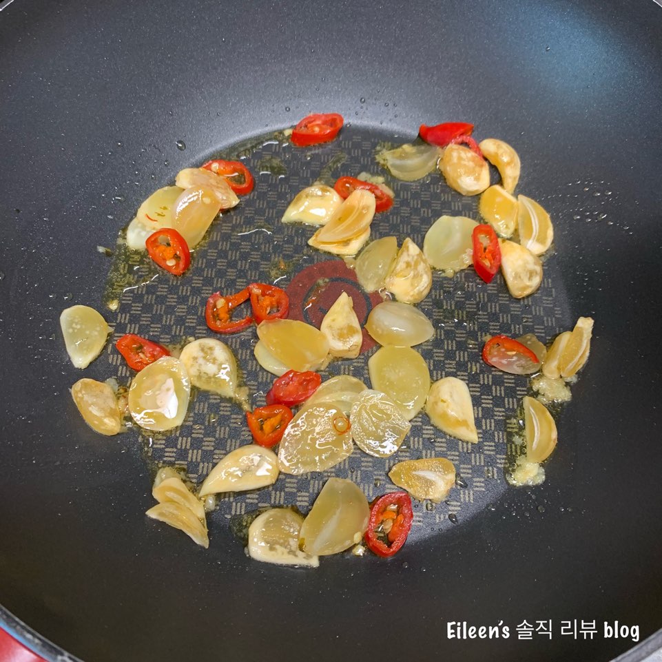 예쁘게 썬 홍고추와 마늘을 넣고 볶아줬습니다 : )
