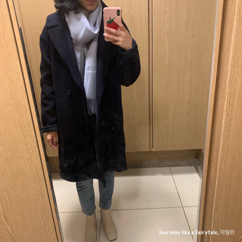 흰 터틀넥 + 네이비 코트 + 하늘색 머플러까지!!